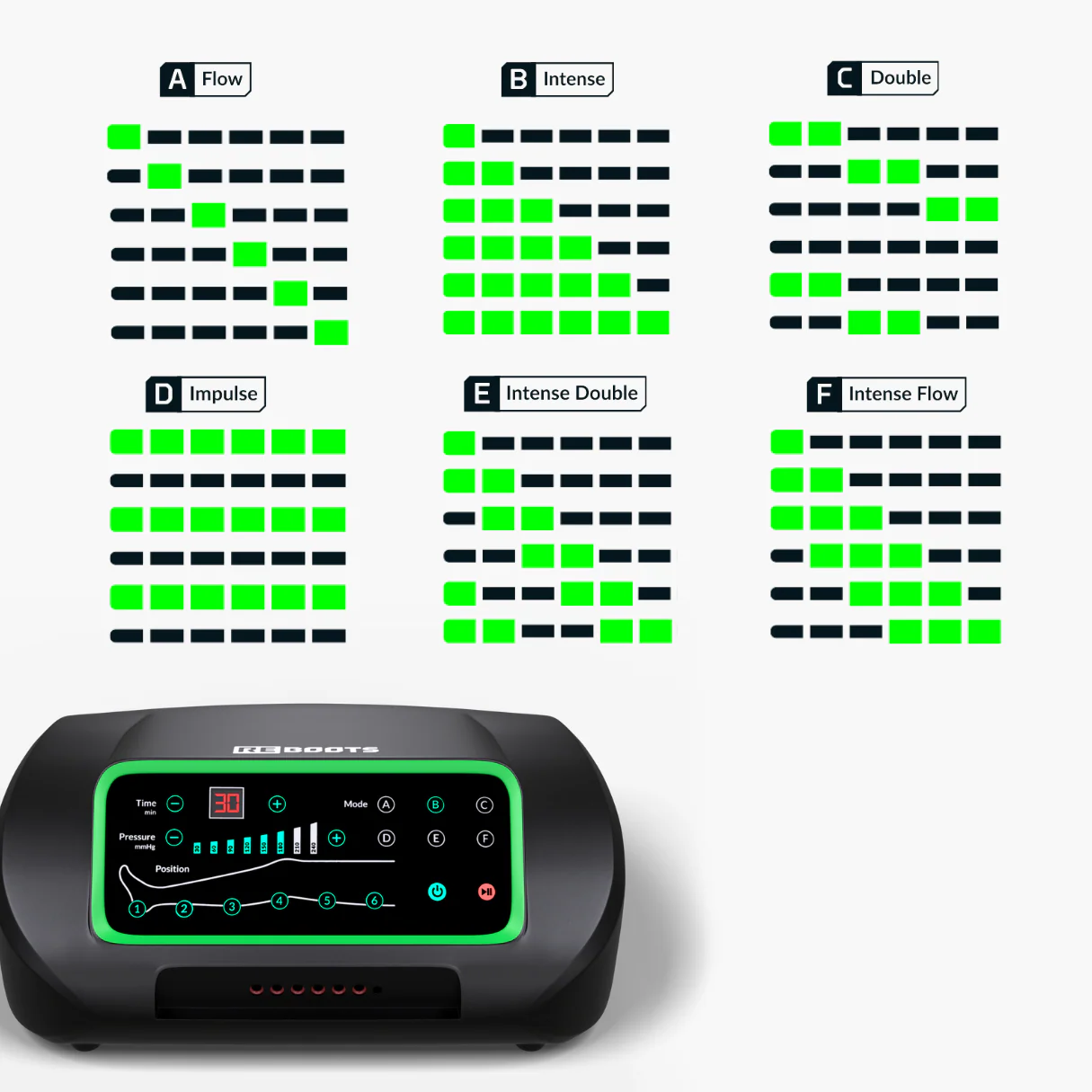 Wähle aus 6 verschiedenen Massageprogrammen – von sanft bis intensiv – und finde genau die Einstellung, die zu deinem Regenerationsbedarf passt. -